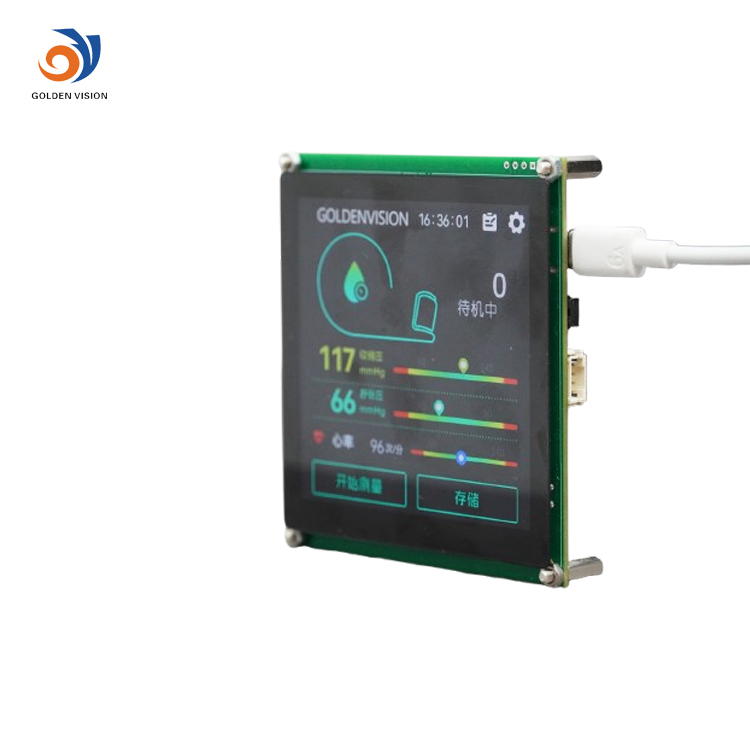 Interface d'écran LCD IPS UART de 4 pouces avec fonction tactile capacitive, conçue pour les appareils médicaux tels que les tensiomètres. Caractéristiques : résolution 480×480, faible consommation d'énergie (<1,5 W), et une large plage de températures.